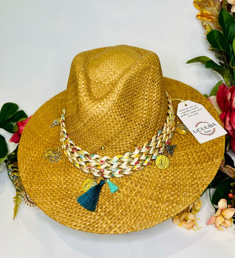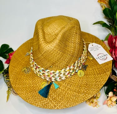 Enjoy sunny days with our Golden Hat, carefully crafted by Colombian artisans. It features a beautiful braided multi-color band and a variety of charming decorative details. Ideal for beach outings or casual parties, this hat combines style and functionality. Available in various sizes to ensure a perfect fit for everyone. This hat is an exclusive Ucuuba design.